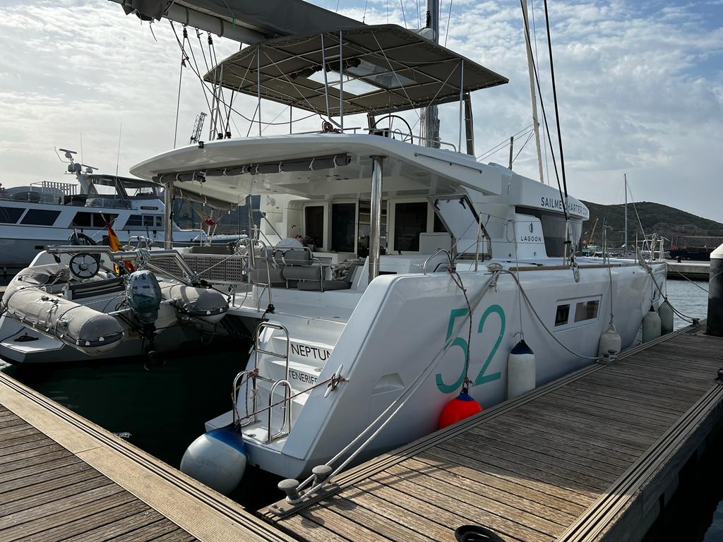 Lagoon 52F Neptuno is a luxurious and spacious 52-foot catamaran with a modern design. It features six cabins, each with its own en-suite bathroom, providing comfortable accommodation for up to twelve guests. The catamaran is equipped with a full-batten mainsail and self-tacking jib for excellent performance under sail. The Lagoon 52 is perfect for families and groups of friends looking to explore the world's most beautiful sailing destinations in style and comfort.